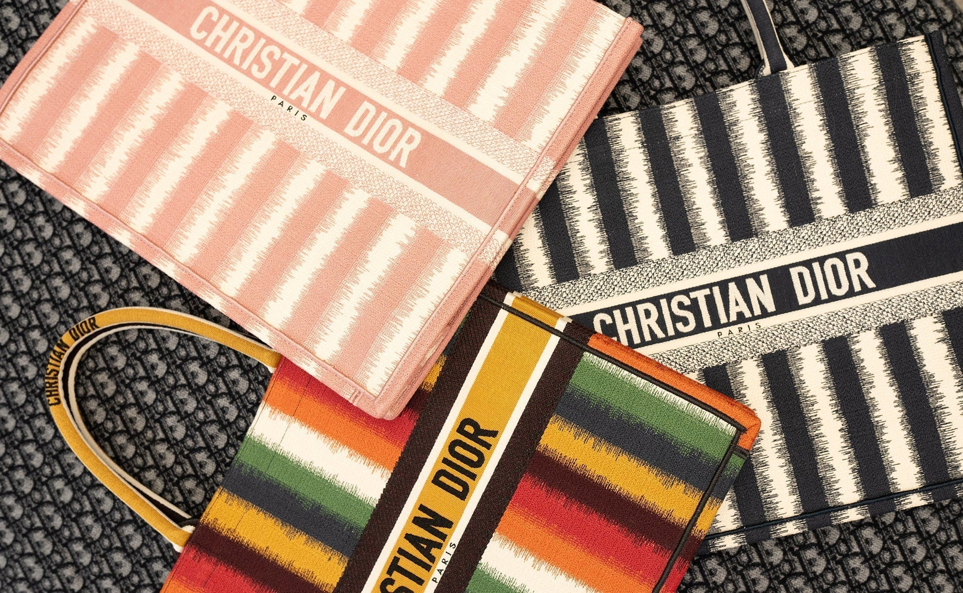 Tato taška Dior Book Tote ve velké velikosti je super oblíbená a všestranná taška, kterou lze nosit každý den a je perfektní na cesty, na pláž i k bazénu na dovolenou. V kolekci Leto 2021 je tato jedinečná výšivka s D-Stripes naprosto úžasný kousek.