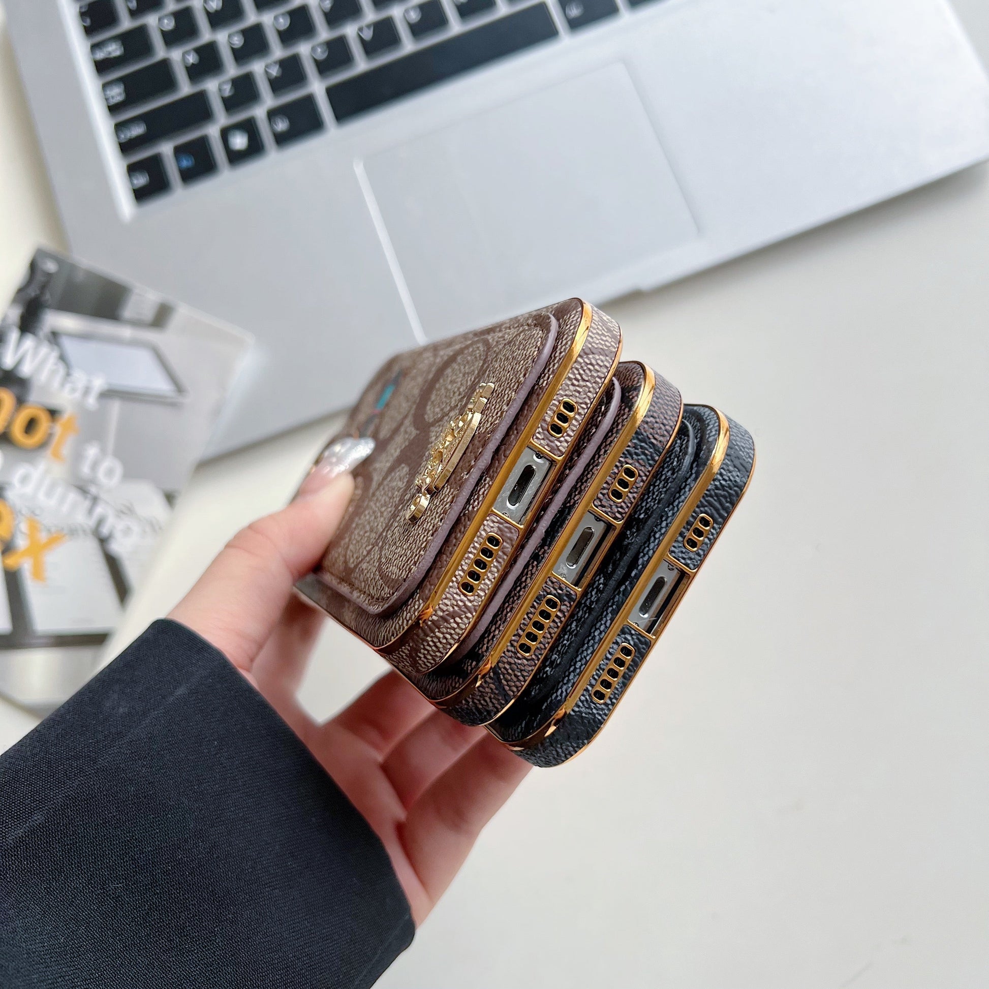 Elevate your iPhone experience with the Coach iPhone Case in rich Brown hue, featuring a convenient card holder. Combining style and functionality seamlessly for a sophisticated everyday essential.