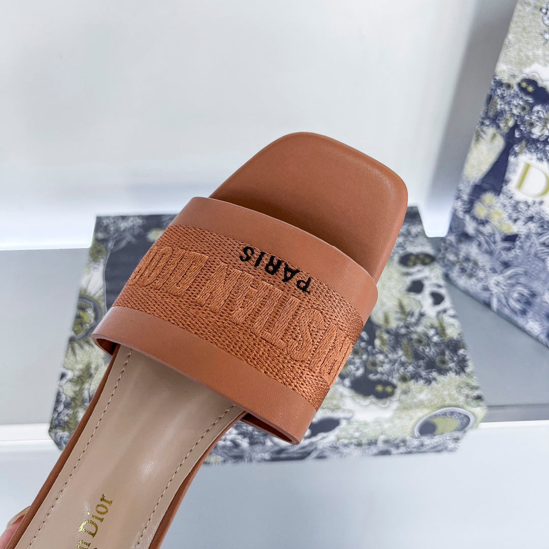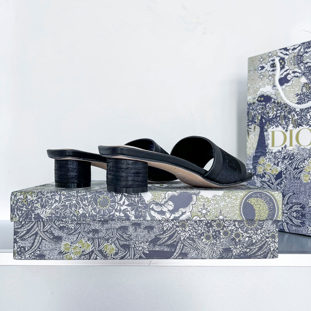 - Part of the Or capsule. the Dway heeled slide revisits a hallmark creation in a modern variation. Crafted in gold-tone satin embroidered with metallic thread. it showcases the signature embroidered on the upper as well as a very contemporary square toe. Completed with a 3.5 cm (1.5) cylindrical heel. the slide will lend a modern touch to any attire and will pair effortlessly with other Or creations.