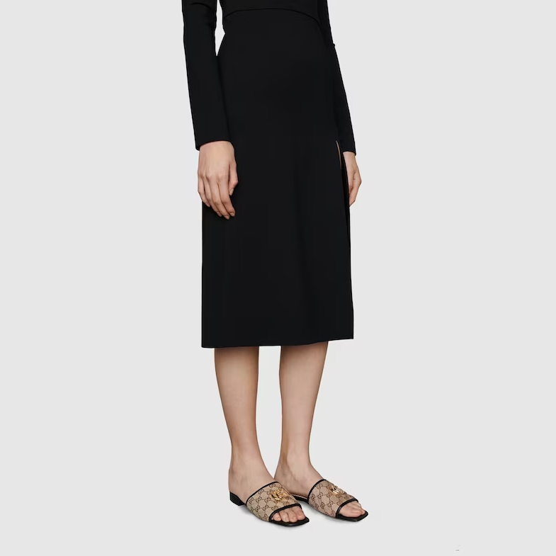 - Sapatos clássicos foram reinterpretados com uma conotação distinta da identidade da marca. Esta sandália é feita de lona GG clássica acolchoada em sarja, engenhosamente adornada com acessórios clássicos em formato de G duplo da década de 1970, homenageando a longa tradição de design da marca com um design atemporal.