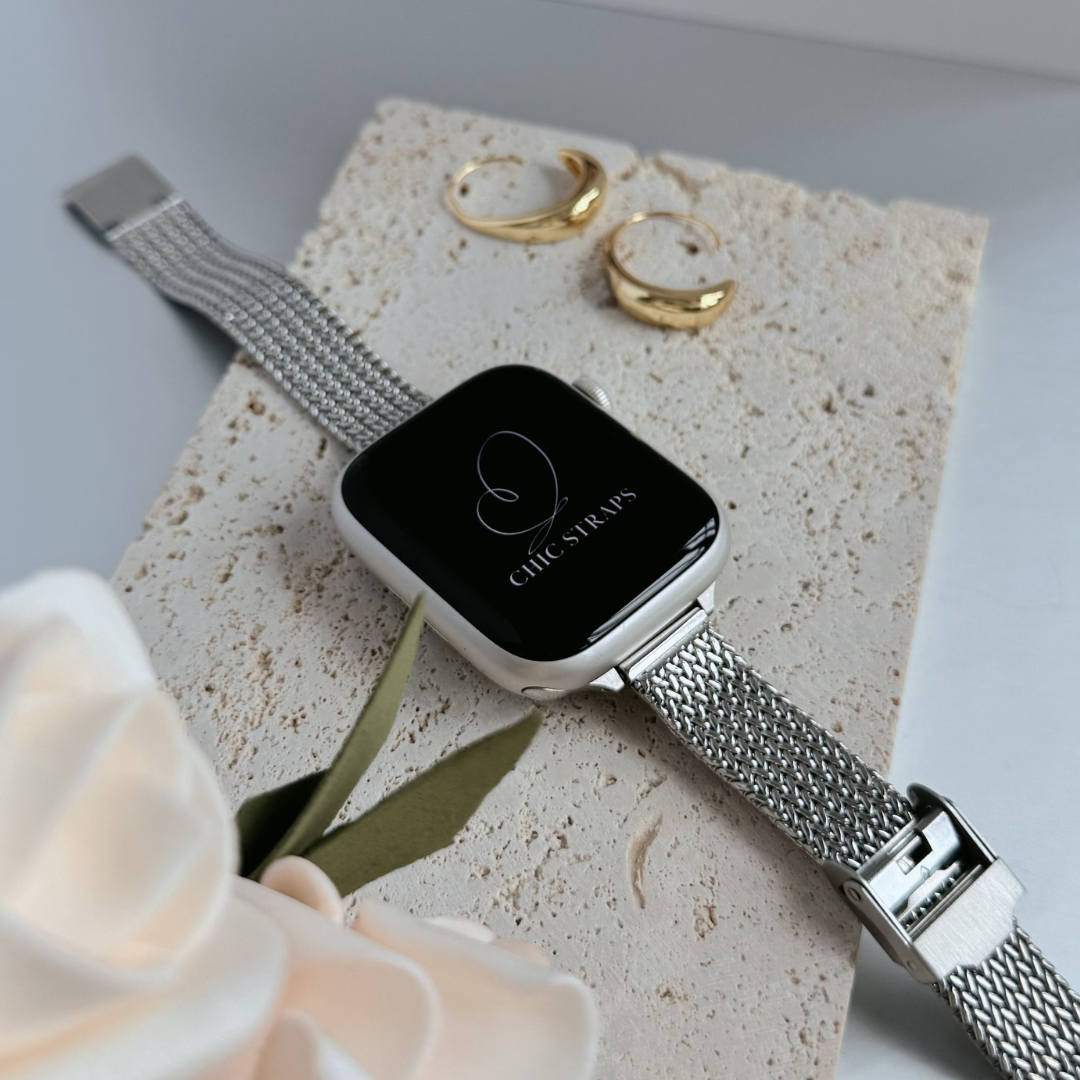 Ponorte sa do nadčasového čaru milánskeho remeselného spracovania s elegantným a štíhlym dizajnom, ktorý bezproblémovo dopĺňa elegantné kontúry vašich Apple Watch. Tento remienok na hodinky je vyrobený z vysoko kvalitnej nehrdzavejúcej ocele, takže je nielen odolný, ale vyžaruje aj pocit rafinovanosti a luxusu.