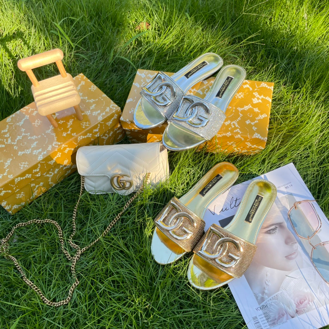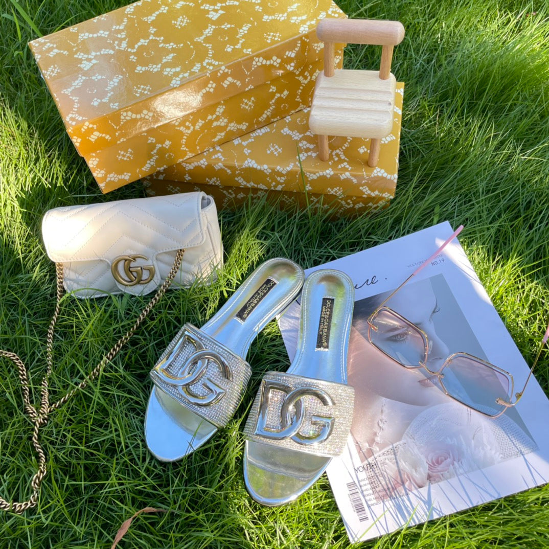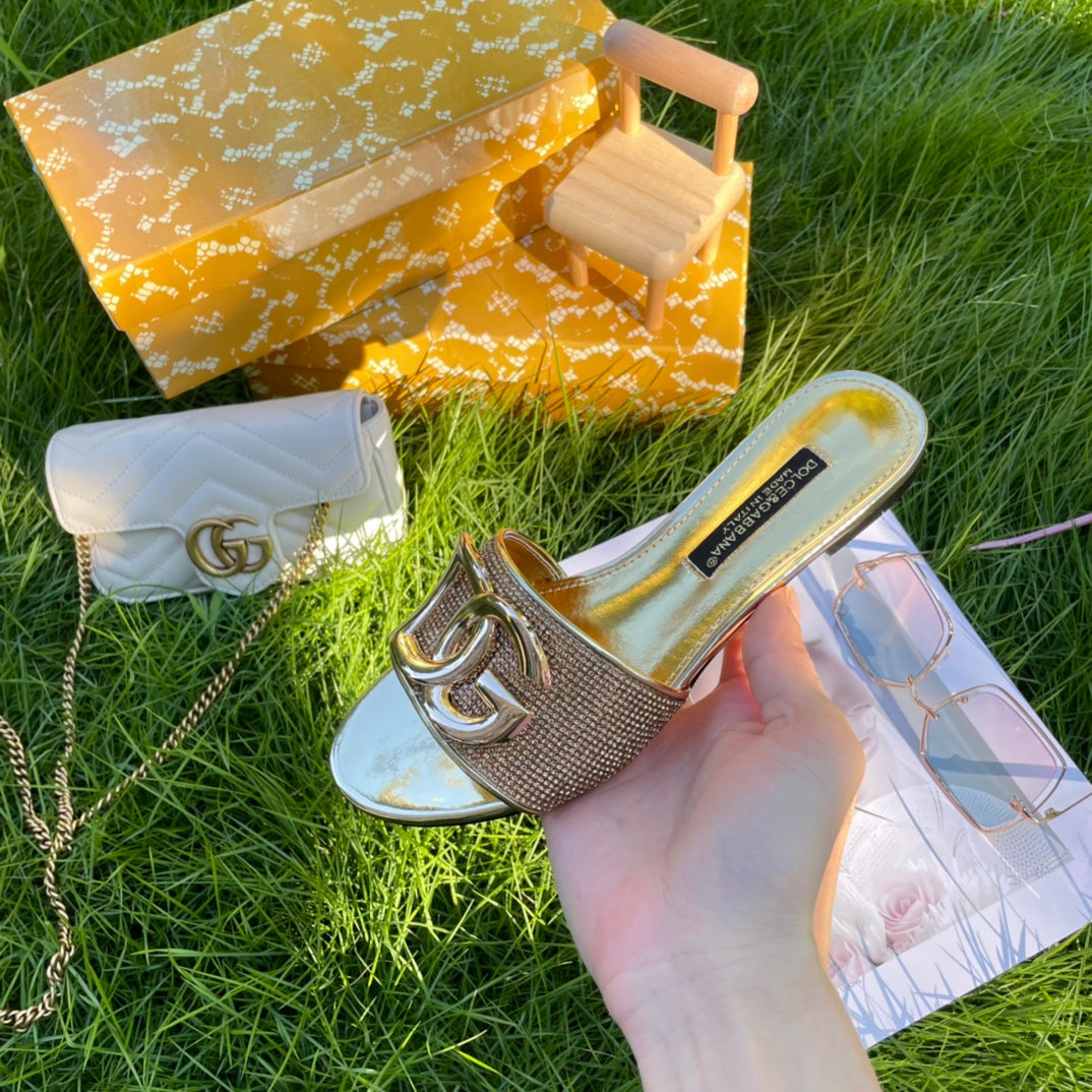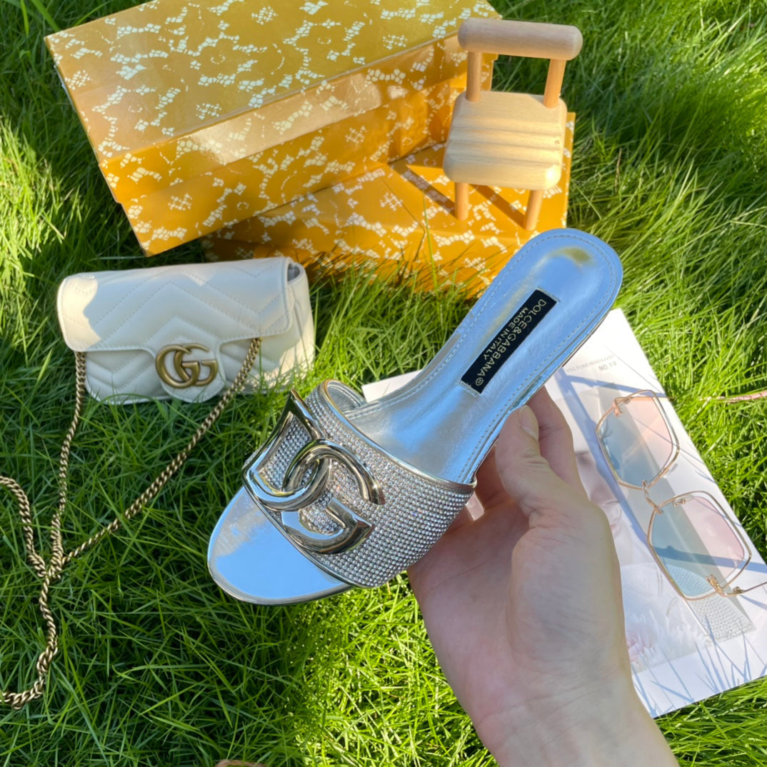 - Guld &Silverfärgade lädersandaler i läder med kristallutsmyckning och logotyp. Mandelfärgad tå. Logga innersula. Platt gummisula och kristallutsmyckad logotyp.
